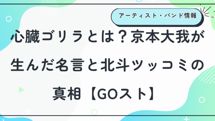 アーティスト・バンド情報心臓ゴリラとは?京本大我が生んだ名言と北斗ツッコミの真相【GOスト】 2025年9月放送の「ゴールデンSixTONES(GOスト)」の名場面として、SNSで話題をさらったのが京本大我さんの一言「僕、心臓ゴリラなんで」。スイカ爆発ギリギリ予測のコーナー中に飛び出したこの発言は、すぐさまファンの間でトレンド入り。... 2025.09.28アーティスト・バンド情報