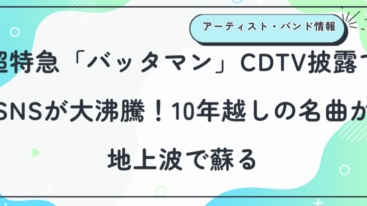 アーティスト・バンド情報超特急「バッタマン」CDTV披露でSNSが大沸騰!10年越しの名曲が地上波で蘇る 2025年9月29日放送のTBS『CDTVライブ!ライブ!』で、超特急が新曲「NINE LIVES」と共に2015年リリースの「バッタマン」を披露しました。まさかの選曲にSNSは即座に沸騰し、「地上波でバッタマン!?」「泣きそうになった」と... 2025.09.29アーティスト・バンド情報