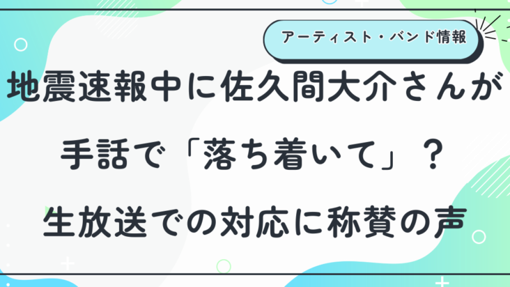 アーティスト・バンド情報【ラヴィット】地震速報中に佐久間大介さんが手話で「落ち着いて」?生放送での対応に称賛の声 2025年10月7日(火)朝9時30分ごろ、TBS系『ラヴィット!』放送中に地震速報が流れました。その際、ワイプに映ったSnow Manの佐久間大介さんが、手話で「大丈夫」「落ち着いて」と呼びかけるような動作をしていたとSNSで話題に。生放... 2025.10.07アーティスト・バンド情報