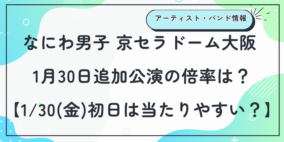 結論から言うと、1月30日(金)京セラドーム大阪の追加公演倍率は、約2.0〜2.5倍程度(全6公演中で最も当たりやすい)と予測されます。
